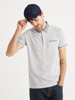 Bavlněné polo tričko. Drobná jemná pique štruktúra. Výrazný melírovaný vzor. Krátky rukáv a golier so zapínaním na gombíky.