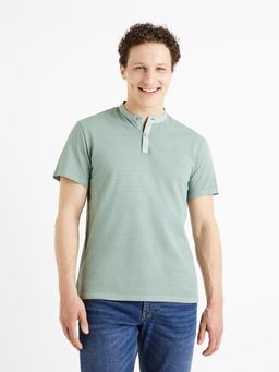 Polo tričko bez límečku. U krku zapínání na dva knoflíčky. Krátké rukávy a rovný střih. Příjemný bavlněný úplet.