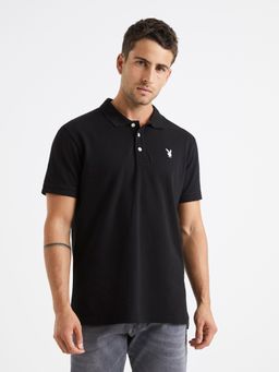 Bavlněné polo tričko v černé barvě. Limitovaná edice Playboy. Decentní potisk. Krátký rukáv a bílé knoflíčky.