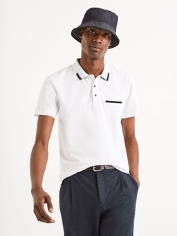 Polo tričko s barevným olemováním límečku. Krátký rukáv a rovný střih. S obsahem elastanu.
