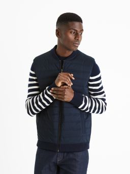 Jednobarevná vesta bez rukávů je v přední části prošívaná a v zadní části má pružný úplet. Zapíná se na zip. Přední šikmé kapsy. Pružné žebrované náplety. Vestu lze nosit samostatně na svetr nebo mikinu a v zimě pod volnější bundu nebo kabát.