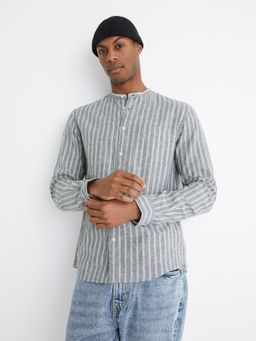 Pruhovaná košile ve střihu regular a s dlouhým rukávem. U krku stojáček bez límečku. Celopropínací se zapínáním na knoflíčky. Rukávy mají našité klasické manžety. Na hrudi našitá malá kapsička. Vyrobena ze směsi lnu a bavlny.