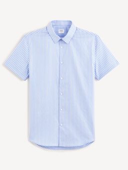 Pruhovaná košile se zapínáním na knoflíčky. U krku límeček a slim střih. Krátký rukáv a rovný střih. Zaoblený spodní lem.