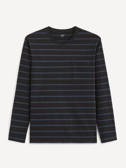 Pruhované tričko s dlouhým rukávem. Na hrudi našitá malá kapsička. Kulatý výstřih s pružným lemem. Měkký bavlněný úplet.