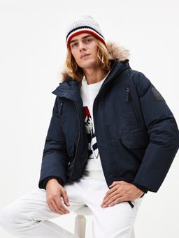 Krátká hřejivá bunda. Kapuce s umělou kožešinou na pevno. U krku vysoký límec. Zapínání na zip a krycí klopa na suchý zip. Na prsou dvě šikmé kapsy na zip. Další dvě přední kapsy s klopou a bočním vstupem. Široké a pružné náplety.