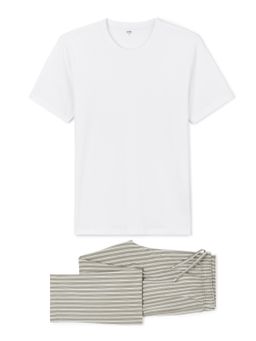 Pohodlné pyžamo pro pohodové večery pro muže tvoří jednoduché zelené tričko z bavlněného žerzeje a dlouhé pruhované kalhoty z téže měkké látky. Dokončete pohodlný vzhled sladěnými pantoflemi.