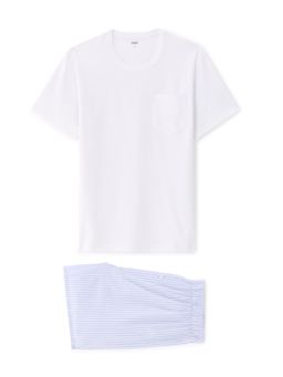 Vklouzni do pohodlí s tímto pyžamem, které ti zajistí klidné noci i stylová rána. Lehký bavlněný žerzej příjemně obejme tělo. Bílé tričko s krátkým rukávem je jednoduché a univerzální, zatímco pruhované boxerky dodají celku hravý a moderní nádech.
