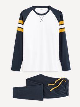 Pyžamo s dlouhým rukávem a nohavicemi. Pružný bavlněný úplet. Tričko má raglánové rukávy s barevnými pruhy. U kalhot v pase žlutá stahovací šňůrka.