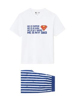 Probuď v sobě hrdinu – i během spánku! celio představuje exkluzivní limitovanou edici pyžama SUPERMAN, které ti dodá sílu i styl ještě před ranní kávou. Horní díl tvoří bílé tričko s výstřihem do V, krátkými rukávy a heroickým nápisem spolu s legendárním logem Supermana na hrudi. Spodní díl tvoří pohodlné bílé pyžamové kraťasy s modrými pruhy, zapínáním na knoflík a modrým elastickým pasem, který skvěle padne.