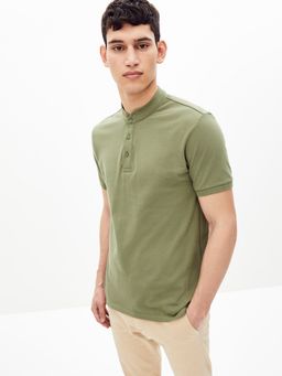 Bavlněné tričko se zapínáním na 3 knoflíčky u krku. Krátké rukávy a rovný střih. Jednobarevné.