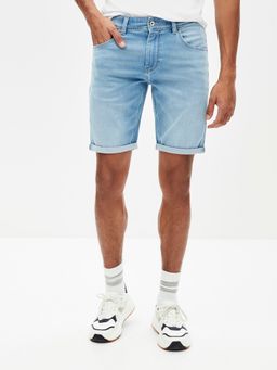 Džínové kraťasy s pevným pasem. Zapínání na zip a knoflík. Standardních 5 kapes a poutka na pásek. Příjemný materiál s elsatanem. Zarolované konce nohavic. Volnější střih v délce nad kolena.