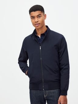 Tmavě modrá bunda na zip. Vodoodpudivá úprava. Vysoký límec se zapínáním na knoflíky. Šikmé boční kapsy. Široké a pružné náplety. S hladkou podšívkou.