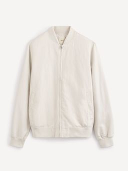 Tmavě modrá bunda ve střihu bomber. Se zapínáním na zip. Šikmé boční kapsy. Široké a pružné náplety. Příjemný materiál směsi bavlny a lnu. S hladkou podšívkou.
