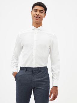 Bílá bavlněná košile s moderním krátkým límečkem. Dlouhé rukávy s náplety. Zapínání na knoflíčky.