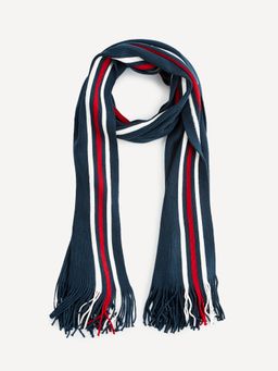 Pletená šála s třásněmi. Pruhy bílé a červené.