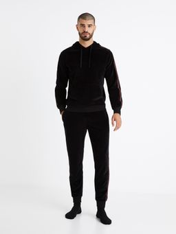 Sametové pyžamo. Mikina s kapucí a klokaní kapsou. Na rukávech ozdobný pruh. Sametové tepláky s pružným pasem a pruhem. V pase stahovací šňůrka. Dlouhé nohavice s pružným lemem.