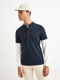 Jednobarevné bavlněné tričko. Stojáček ke krku se zapínáním na tři knoflíčky. Krátký rukáv a rovný střih.