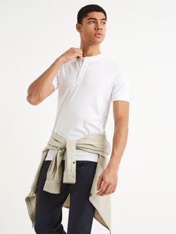 Jednobarevné tričko se stojáčkem a zapínáním na tři knoflíčky. Krátký rukáv a rovný střih.