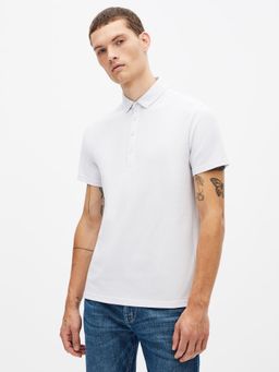 Jednobarevné polo tričko. Límeček ke krku. Zapínání na čtyři knoflíčky. Krátký rukáv a příjemný materiál s elastanem.