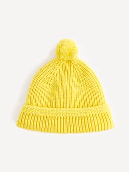 Pletená čepice s bambulí. Ohrnutý lem. Příjemný materiál s příměsí vlny.