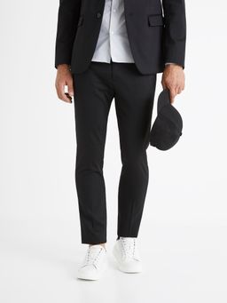 Kalhoty oblekové ve slim střihu. Skryté zapínání na zip, háček a knoflík. Pevný pas s poutky na pásek. Přední šikmé kapsy a zadní kapsy se zapínáním na knoflíčky. Příjemný materiál s elastanem. Nažehlené puky.