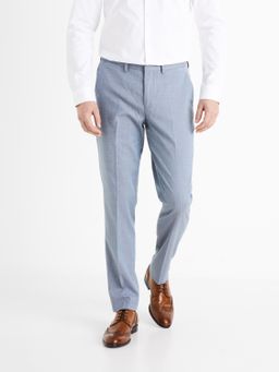Oblekové kalhoty v oblíbeném slim střihu. Pevný pas s poutky na pásek, skryté zapínání na zip, háček a knoflík. Praktické přední šikmé kapsy a zadní kapsy se zapínají na knoflíčky. Příjemný a pružný materiál. Nažehlené puky opticky zúží a protáhnou nohy.