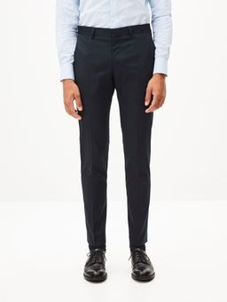Kalhoty oblekové ve slim střihu. Skryté zapínání na zip, háček a knoflík. Pevný pas s poutky na pásek. Přední šikmé kapsy a zadní kapsy. Příjemný materiál s elastanem. Nažehlené puky.