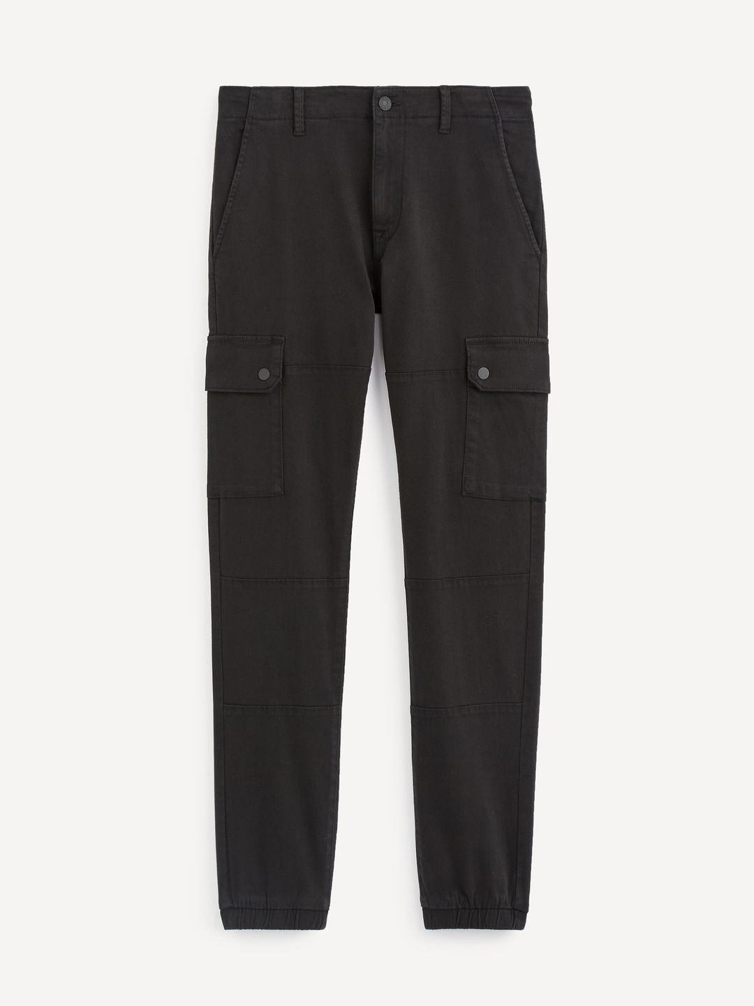 Kalhoty cargo ve slim střihu. Sportovní střih s kapsami. Pevný pas se zapínáním na zip a knoflík. Šikmé boční kapsy. Bavlna s elastanem.