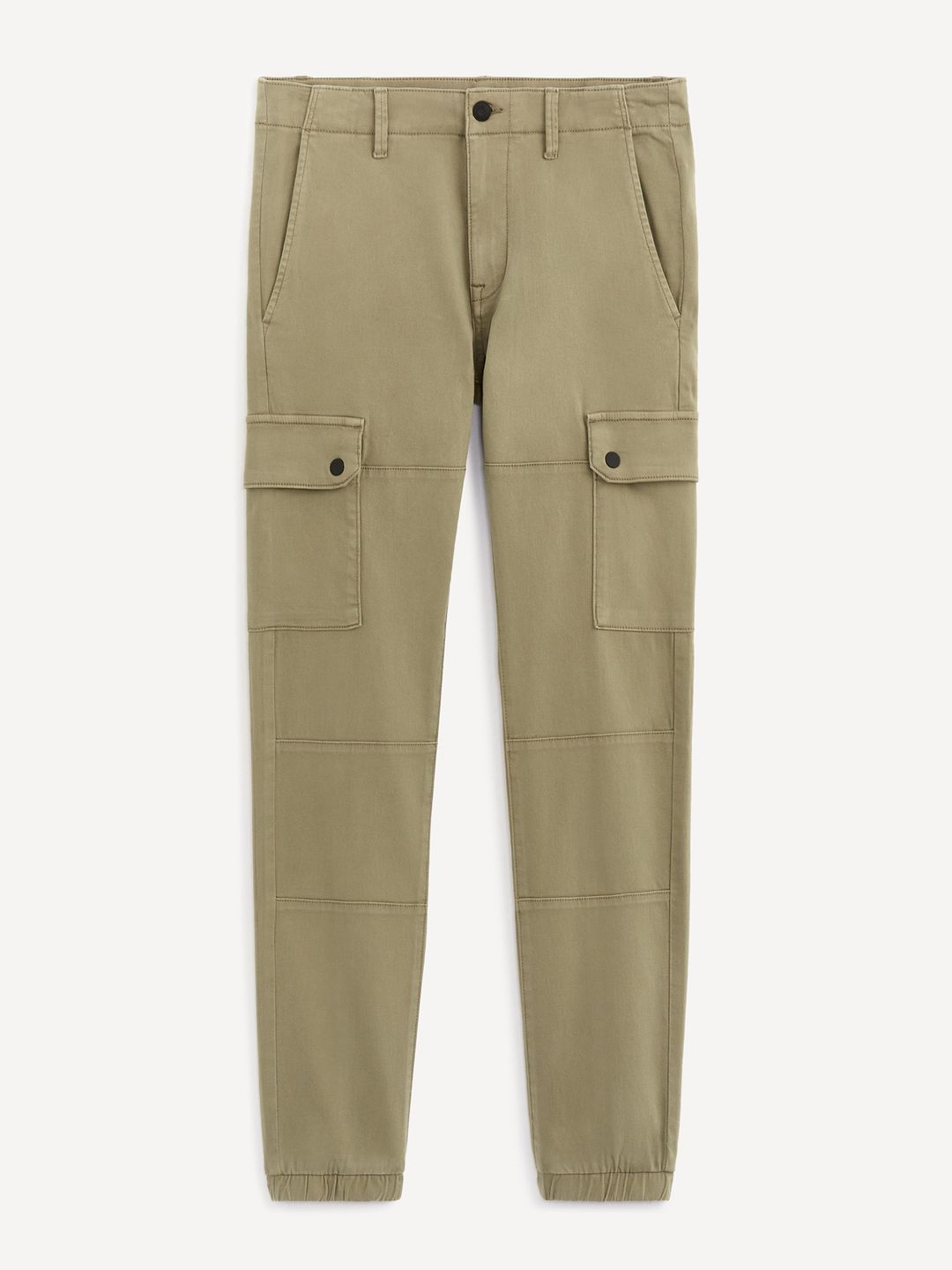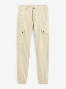 Bavlněné sportovní kalhoty cargo s elastanem. Jednobarevné kapsáče s vyšším pasem a bočními kapsami. Pevný pas s poutky na pásek. Přední a zadní kapsy.