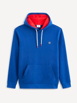Sportovní mikina s píšťalkou v kapse. Výrazná modrá barva s kapucí s červenou podšívkou. Kapuce má navíc stahovací tkaničku v bílé barvě. Prostorná klokaní kapsa a dlouhé rukávy s náplety. Na hrudi drobný kopací míč.