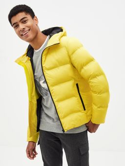Prošívaná bunda s kapucí. Zapínání na zip. Zářivá žlutá barva. Přední kapsy na zip. Vnitřní kapsička na zip.