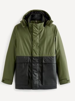 Bunda na jaro a podzim z pogumovaného materiálu. Odepínací kapuce. Zapínání na zip s krycí klopou. Velké přední kapsy s klopou na patentky. Kombinace zelené a černé barvy.