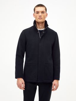 Kratší kabát z vlněného materiálu se stojacím límcem z úpletu. Zapínání na zip a krycí klopa na patentky. Přední velké kapsy. Skrytá vnitřní kapsa na zip.