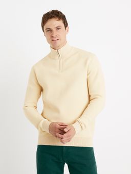 Svetr ve smetanové barvě. U krku stojáček se zapínáním na zip. Dlouhé rukávy s pružným žebrovaným lemem. Jednoduchý svetr se hodí k džínům a teniskám.