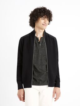 Jednobarevný svetr kardigan se zapínáním na zip. U krku stojáček. Přední šikmé kapsy se zapínáním na zip. Na ramenou látkové vsadky. Široké a pružné lemy.