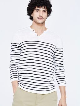 Tenký pruhovaný svetr. Ozdobný výstřih s knoflíčky. Dlouhé rukávy a rovný střih. 100% bavlna.