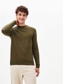 Hladce pletený svetr. Střih přes hlavu. Dlouhé rukávy a pružné žebrované lemy.