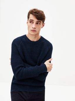 Pánský jednobarevný svetr. Raglánové rukávy. Kulatý výstřih s pružným lemem. Svetr zdobí drobný vzor. Příjemný materiál obsahuje vlnu.