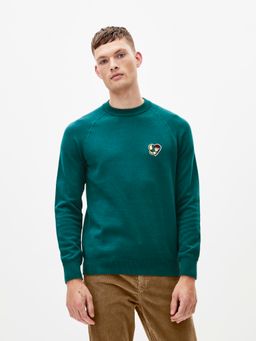 Pánský bavlněný svetr v zelené barvě. Drobná barevná výšivka na hrudi ve tvaru srdce. Kulatý výstřih ke krku s pružným lemem. Svetr skvěle doplní modré džíny nebo béžové kalhoty.