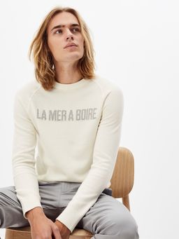 Jednobarevný pletený svetr s nápisem La mer a boire. Kulatý výstřih. Pružné lemy. Příjemný materiál.
