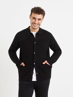 Kardigan s košilovým límcem. Zapínání na knoflíčky. Přední dvě velké kapsy.