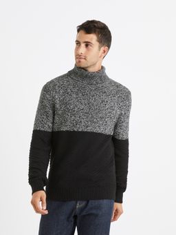 Pletený svetr s rolákem. V horní části šedý melír a spodní část černá. Příjemný a hřejivý materiál.