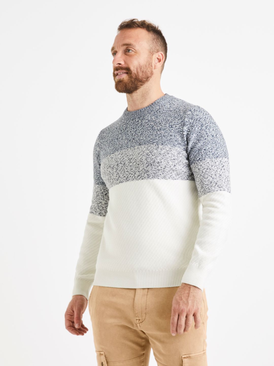 Pletený svetr s barevným odstupňováním v podobě melírovaných pruhů. Drobná reliefní struktura. Kulatý výstřih ke krku. Příjemný materiál.
