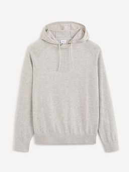 Pletený svetr s kapucí a stahovací šňůrkou. Světle šedý melír. Příjemný materiál.