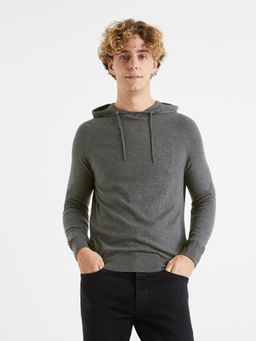 Pánský hladký svetr. Kapuce se stahovací šňůrkou. Tmavě šedý melír. Kulatý výstřih. Pružné lemy. Příjemný materiál.