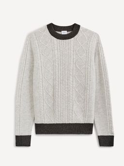 Pletený svetr s kulatým výstřihem. Výrazný vyplétaný vzor. Tmavé náplety. Příjemný materiál s příměsí vlny.