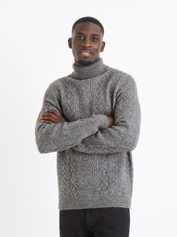 Pletený svetr s vypleteným copánkovým vzorem. U krku výrazný rolák. Příjemný materiál s příměsí vlny.