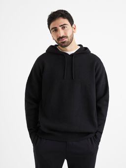 Jednobarevný pletený svetr. Kapuce se stahovací šňůrkou. Příjemný materiál.