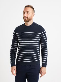 Pletený svetr s pruhy v námořnickém stylu. Kulatý výstřih ke krku. Příjemný materiál.