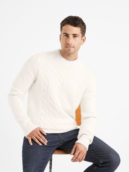 Pletený svetr v bílé barvě a s kulatým výstřihem. Vypletený copánkový vzor.